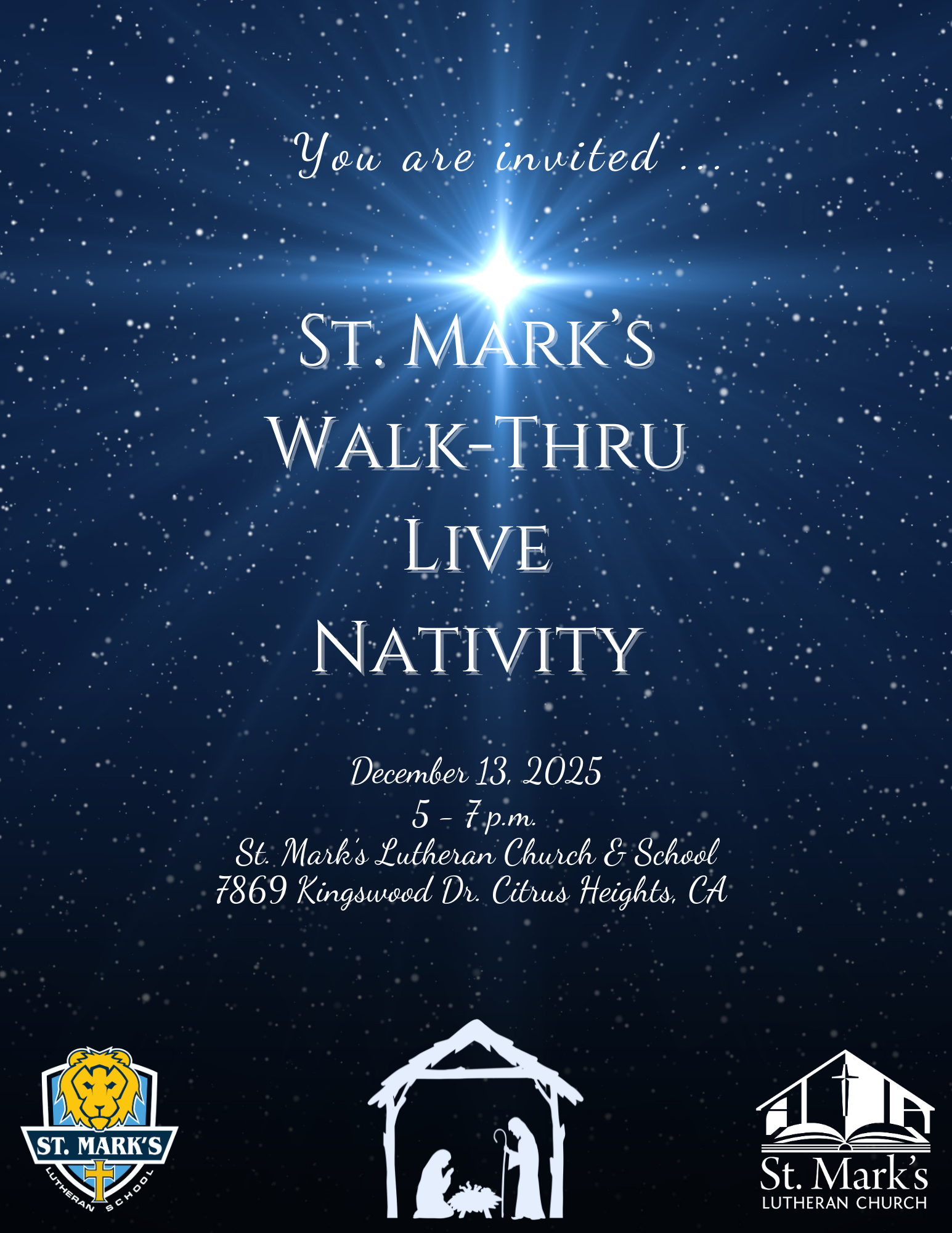 This year’s walk-thru live nativity will occur on TBD from 5 to 7 p.m. Join us for an up-close-and-personal experience of the Christmas story, featuring Jesus, Mary, Joseph, singing, hot chocolate, and more!